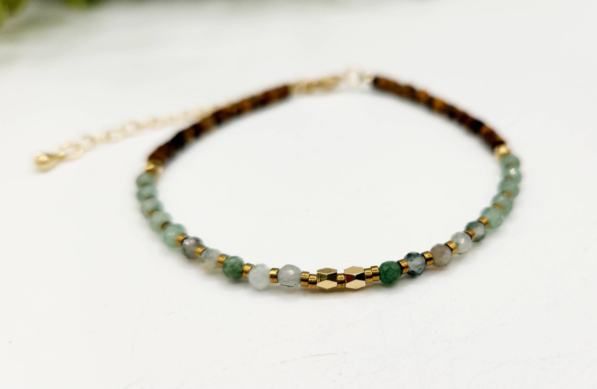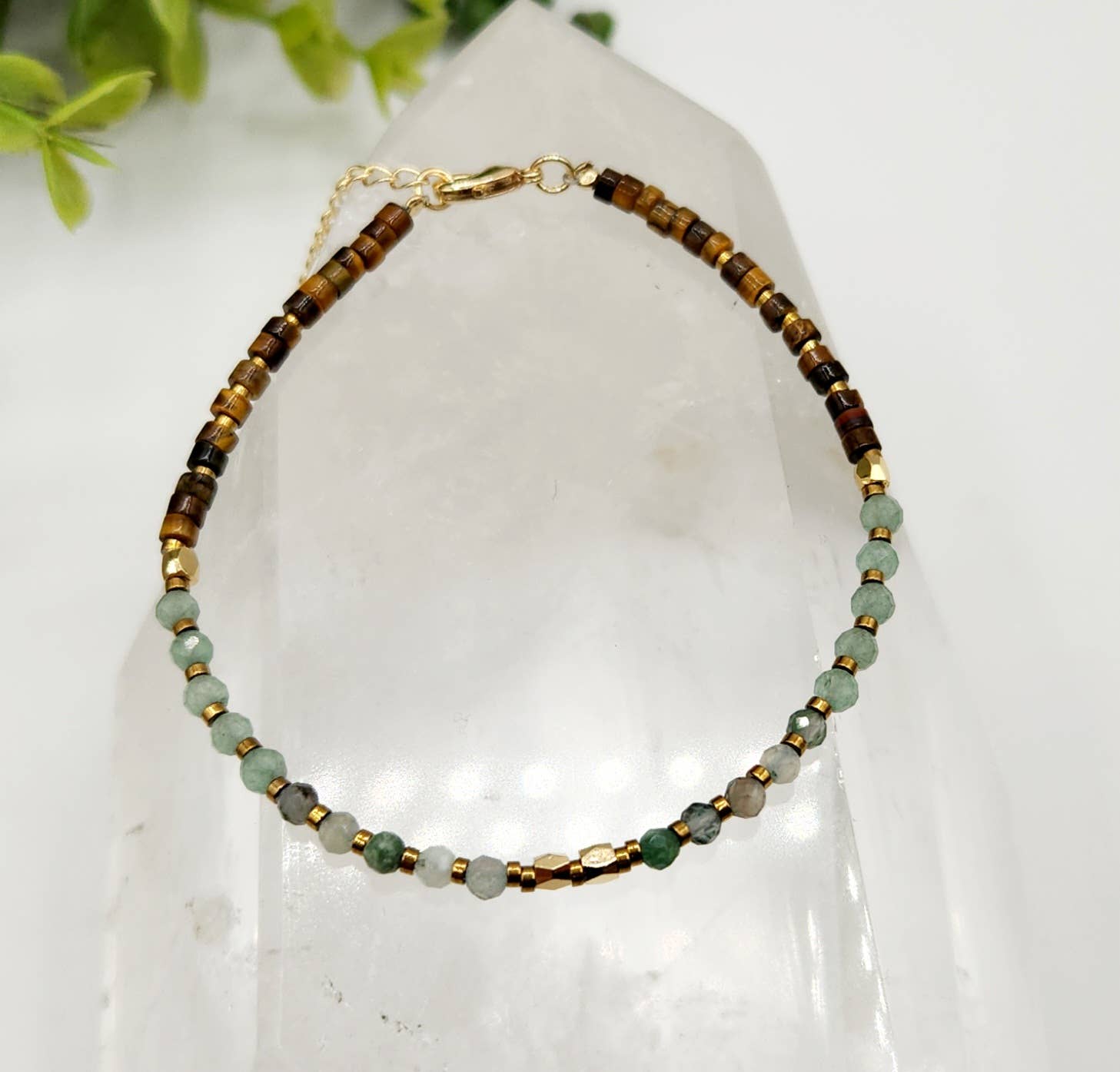 This beautiful bracelet is made with Moss Agate, Green Aventurine, and Yellow Tiger Eye semi-precious gemstone 3mm faceted and heishi beads with gold color metal findings.