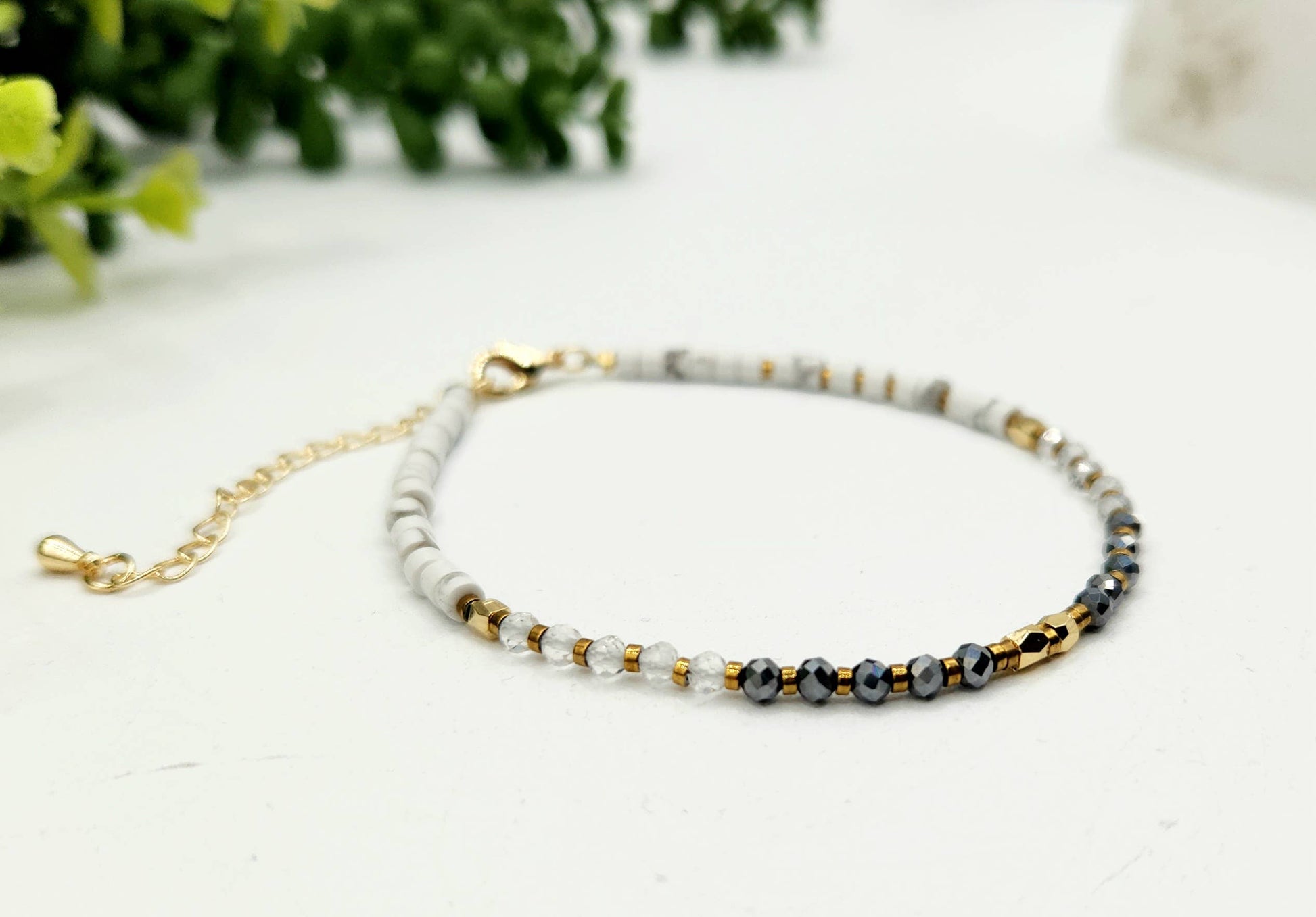 This beautiful bracelet has Terahertz and Clear Quartz 3mm faceted semi-precious gemstones and 3mm White Howlite Heishi gemstone beads with gold color metal findings.
