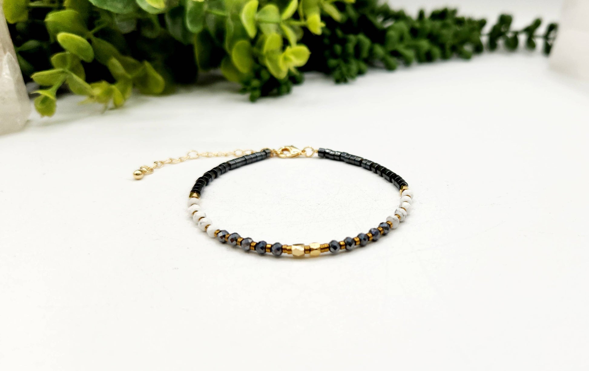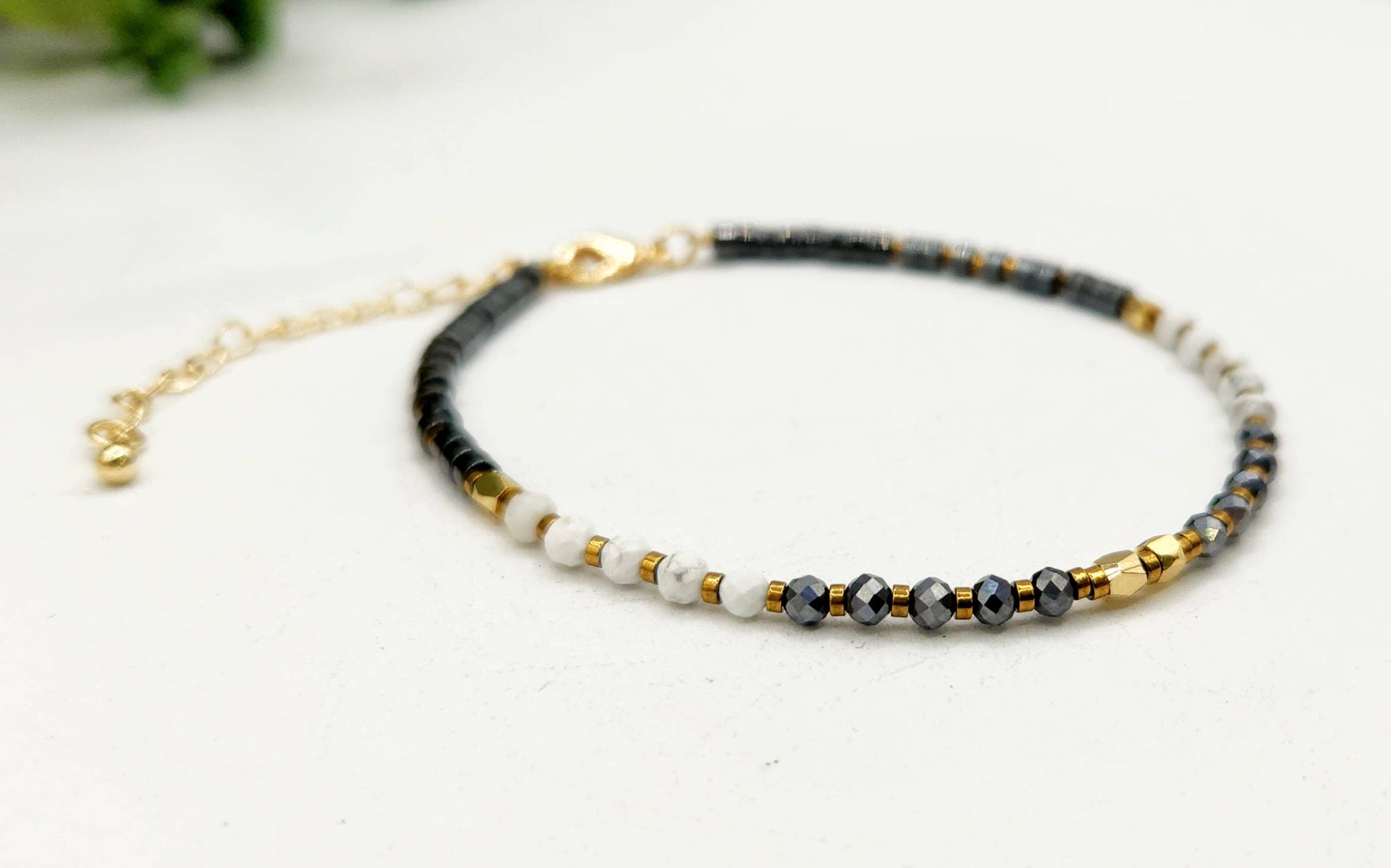 This beautiful bracelet has Terahertz and White Howlite 3mm faceted semi-precious gemstones and 3mm Hematite heishi gemstone beads with gold color metal findings.